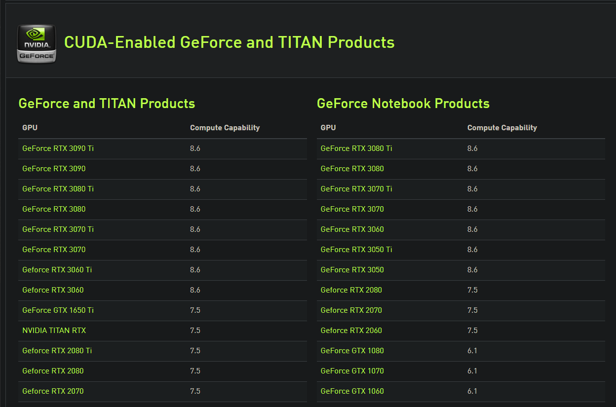 - GPU의 compute capability를 다음 사이트를 통해 찾는다: https://developer.nvidia.com/cuda-gpus