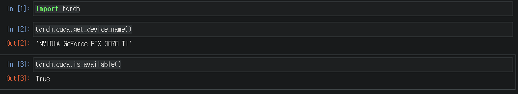 import torch torch.cuda.get_device_name() # CUDA를 실행하고 있는 기기 이름을 나타낸다. torch.cuda.is_available() # CUDA의 활성 여부를 나타낸다.