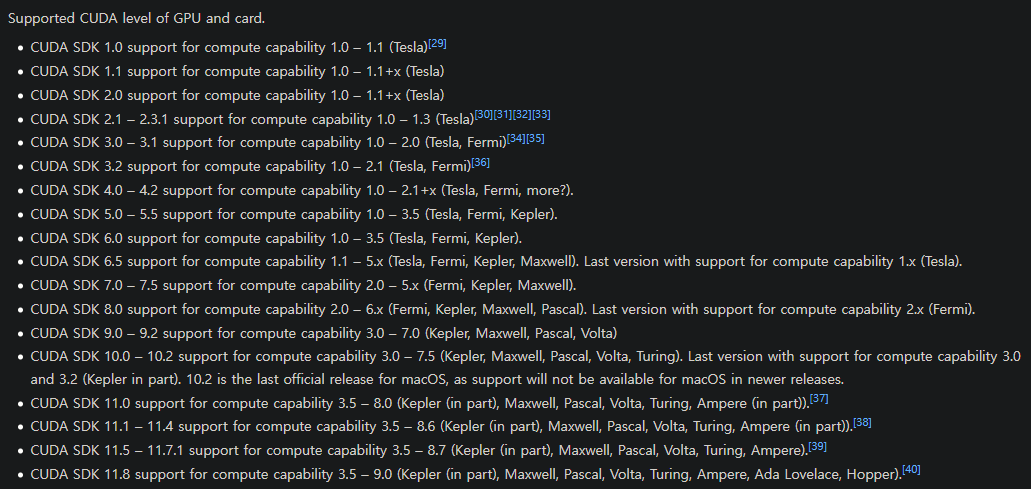 - 다음을 방문하여 본인의 GPU 계산 능력에 호환하는 CUDA 버전을 찾는다: https://en.wikipedia.org/wiki/CUDA